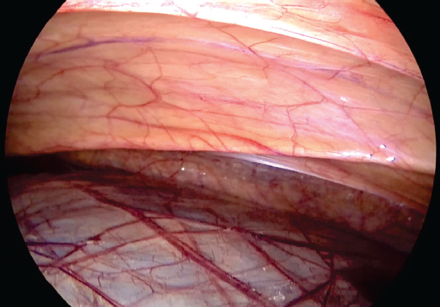 В положении пациента на правом боку установлен оптический троакар 10 мм по методике Хассона, далее под визуальном контролем установлено 3 троакара 5 мм для инструментов в типичном месте. При лапароскопии визуализирована гигантская киста нижнего полюса левой почки (рис. 2). Над ней вскрыта брюшина. Проведена пункция кисты, эвакуировано 5100 мл светло-желтой жидкости. Стенка кисты иссечена в пределах почечной паренхимы и отправлена на гистологическое исследование (рис. 3).
