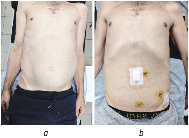 Рис. 4. Передняя брюшная стенка пациента до (а) и после (b) операции в передней проекции.
