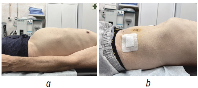 Рис. 5. Передняя брюшная стенка пациента до (а) и после (b) операции в боковой проекции.