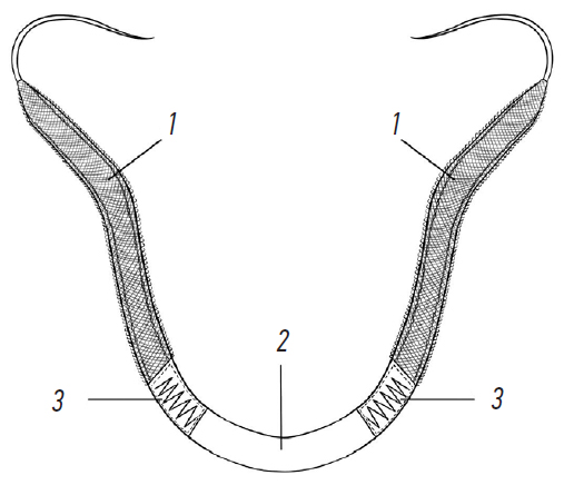 Рис. 1. Комбинированный аллогенно-синтетический слинг. 1 — полипропиленовая сетка, 2 — аллогенный трансплантат «Аллоплант», 3 — зона сшивки материалов.
