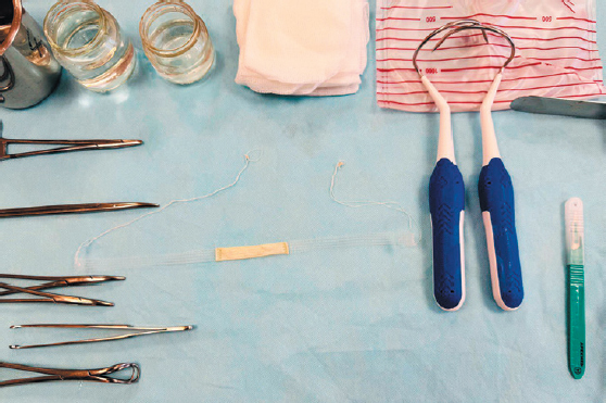 Для улучшения результатов оперативного лечения стрессового недержания мочи у женщин нами разработан комбинированный аллогенно-синтетический слинг, представляющий собой комбинацию полипропиленовой сетки и аллогенного кадаверного материала широкой фасции бедра «Аллоплант». Министерство здравоохранения России одобрило широкое клиническое применение пересадочного материала «Аллоплант» (регистрационное удостоверение № 901 от 22.07.1987). Аллоплант включен в общую классификацию биологической продукции и разрешен к широкому клиническому применению (спецификация № 42-2-537-93, Министерство здравоохранения России, регистрационный номер 056/003230 от 17.05.1993). Забор донорского трупного материала производили в соответствии с Законом Российской Федерации «О трансплантации органов и тканей» № 4181-1 от 22.11.1992. Комбинированный протез содержит синтетическую плетеную ПП-сетку длиной 300 мм, шириной 11 мм, предназначенную для слинговой операции, с интегрированным в середине аллогенным трансплантатом размером 70 × 11 мм, полученный из широкой фасции бедра (рис. 1).