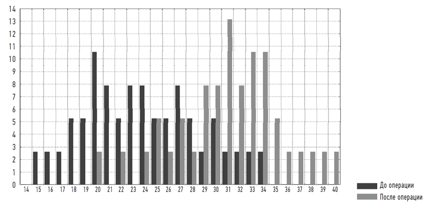 Показатели сексуальной функции оценивали с использованием опросника PISQ-12 (Pelvic Organ Prolapse and Incontinence Sexual Function Questionnaire, опросник сексуальной функции при выпадении тазовых органов и недержании мочи). После операции имело место отчетливое перераспределение частоты суммарных баллов в сторону более высоких, чем до операции, значений, особенно в области более 35 баллов, в которой до операции никаких значений представлено не было (рис. 4). Однако в диапазоне от 20 до 35 баллов даже наиболее резкие различия оказались незначимыми.