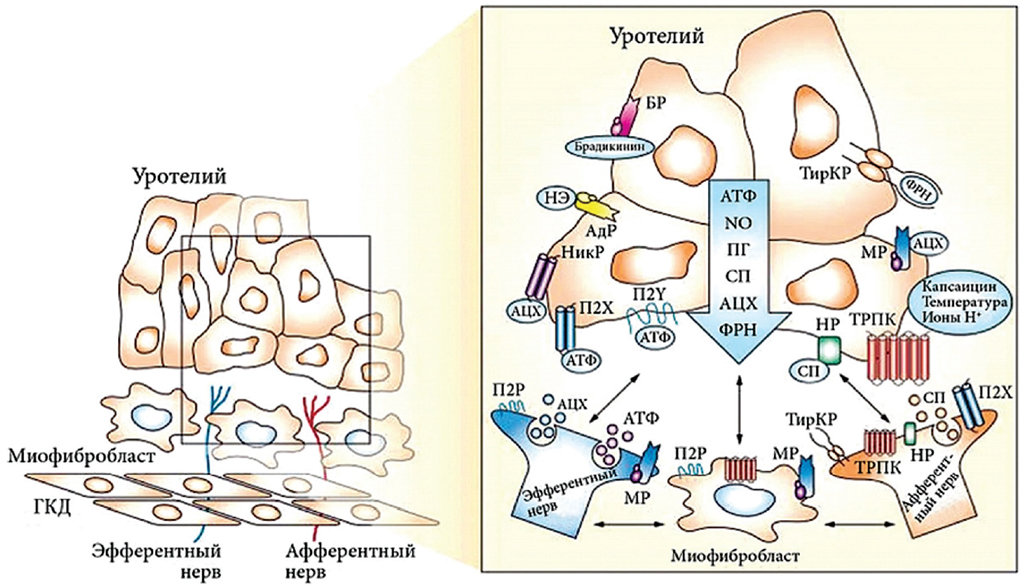 Fig. 1. A hypothetical model of interactions between urothelial cells (urothelium), afferent and efferent nerve endings (neurothelium), vessels (endothelium), smooth muscle cells and myofibroblasts of the lower urinary tract [10, 11]. NO – nitrogen oxide; AдР – adrenergic receptor; ATФ – adenosine triphosphate; AЦХ – acetylcholine; Бр – bradykinin receptor; ГКД – detrusor smooth muscle cell; МР – muscarinic receptor; НикР – nicotinic receptor; HP – neurokinin receptor; НЭ – norepinephrine; П2Р – purinergic receptor subtype 2; П2X and П2Y – purinergic receptors of the X and Y subtypes; ПГ – prostaglandins; СП – substance R; ТирКР – tyrosine kinase receptor with high affinity for nerve growth factor; TРПК – transit receptor of potential channels; ФРН – nerve growth factor / Рис. 1. Гипотетическая модель взаимодействий между уротелиальными клетками (уротелием), афферентными и эфферентными нервными окончаниями (нейротелием), сосудами (эндотелием), гладкомышечными клетками и миофибробластами нижних мочевых путей [10, 11]. NO — оксид азота; АдР — адренергический рецептор; АТФ — аденозинтрифосфат; АЦХ — ацетилхолин; БР — брадикининовый рецептор; ГКД — гладкомышечная клетка детрузора; МР — мускариновый рецептор; НикР — никотиновый рецептор; НР — нейрокининовый рецептор; НЭ — норэпинефрин; П2Р — пуринергический рецептор подтипа 2; П2Х и П2Y — пуринергические рецепторы подтипов X и Y; ПГ — простагландины; СП — субстанция Р; ТирКР — тирозинкиназный рецептор с высокой аффинностью к фактору роста нервов; ТРПК — транзитный рецептор потенциальных каналов; ФРН — фактор роста нервов