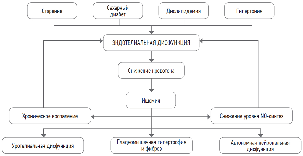 Fig. 2. Scheme of the relationship between endothelial dysfunction and lower urinary tract dysfunction in men [76] / Рис. 2. Схема связи между эндотелиальной дисфункцией и дисфункцией нижних мочевых путей у мужчин [76]