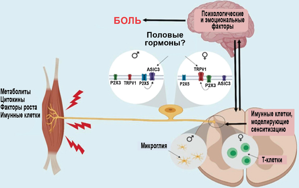 Fig. 3. Gender characteristics of the pathogenesis of muscle pain [89]. TRPV1 – transient receptor potential of vanilloid type 1; P2X3 – type 3 adenosine receptor; Р2Х5 – type 5 adenosine receptor; ASIC3 – type 3 acid-sensitive ion channel / Рис. 3. Гендерные особенности патогенеза мышечной боли [89]. TRPV1 — транзиторный рецепторный потенциал ваниллоидного типа 1; Р2Х3 — аденозиновый рецептор типа 3; Р2Х5 — аденозиновый рецептор типа 5; ASIC3 — кислотно-чувствительный ионный канал типа 3