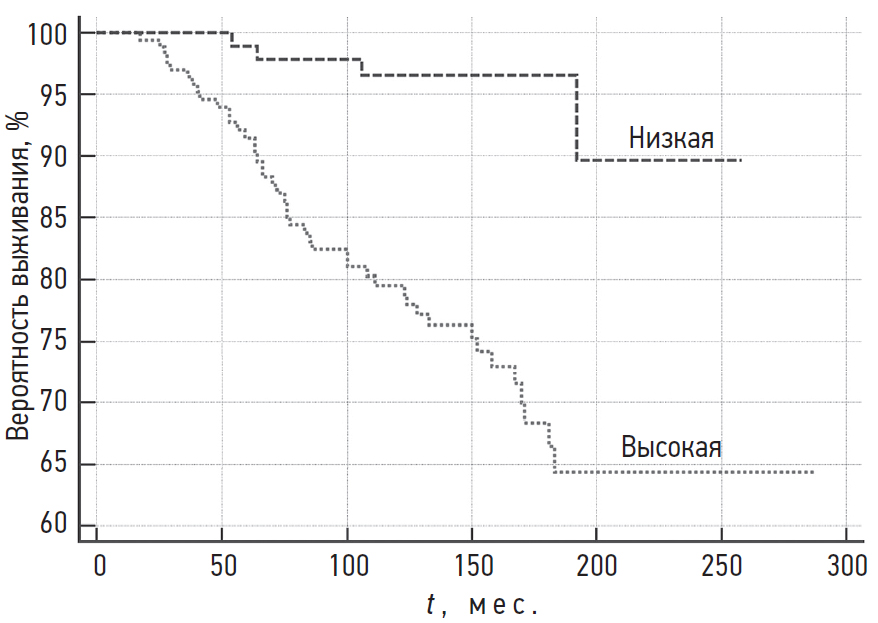 Рис. 2. Опухоль-специфическая выживаемость пациентов с локализованным РПЖ с «высокой» и «низкой» плотностью простатспецифического антигена