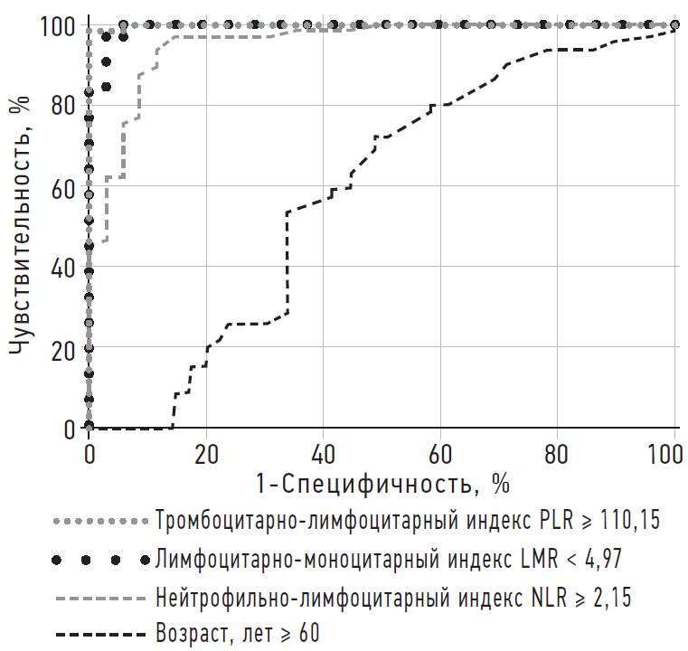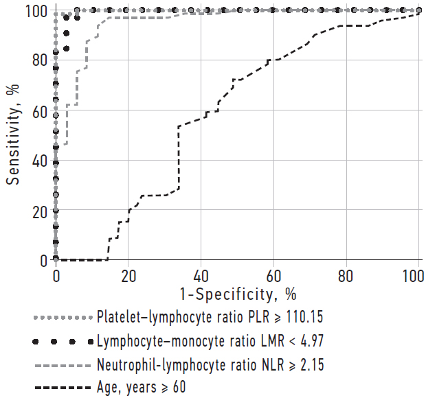 Note. Here and in Tables 2–6. PLR, platelet-lymphocyte ratio; LMR, lymphocyte-monocyte ratio; NLR, neutrophil-lymphocyte ratio. | ||||
