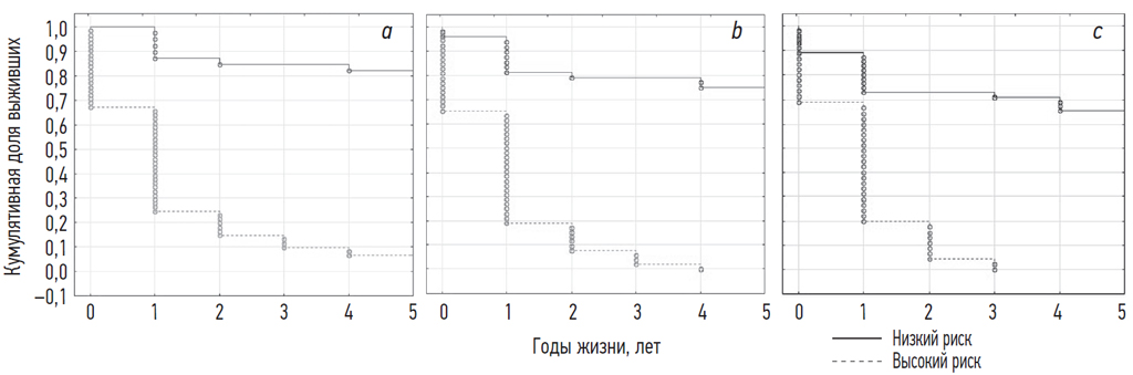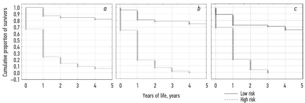 Fig. 2. Cumulative overall survival of patients with muscle-invasive bladder cancer at different values of inflammatory indices: а – overall survival of patients with high and low risk NLR (<0.0001); b – overall survival of patients with high and low risk PLR (<0.0001); с – overall survival of patients with high and low risk LMR (<0.0001)