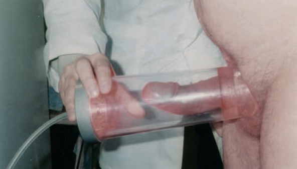 Пациентам обеих групп одновременно с магнитолазерной терапией проводили лечение на аппарате АМВЛ-01, создающем локальное отрицательное давление (ЛОД) при 2 атм в колбе, вызывая эрекцию с длительностью воздействия на половой член в течение 10–20 минут (рис. 1), количество ЛОД-терапии составляет 10 процедур. При выраженной эректильной дисфункции пациентам назначали ингибиторы ФДЭ 5-го типа в индивидуально подобранных дозах. Результаты лечения оценивали через 6 и 12 месяцев от его начала.