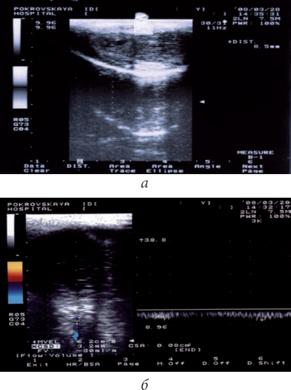 Рис. 2. Ультразвуковая доплерография полового члена больного Д., 36 лет, с болезнью Пейрони и веногенной эректильной дисфункцией: а — в дистальной части полового члена бляшки от 1–2 до 8,5 мм; б — дорсальная вена не спалась, кровоток по ней определяется в течение всего исследования до 30 мл/мин. Проба Вальсальвы положительная