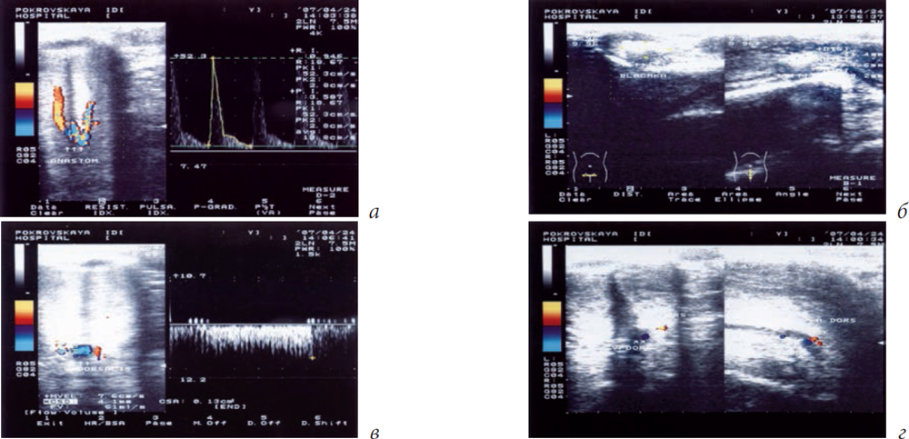 Рис. 3. Ультразвуковая доплерография полового члена больного Т., 55 лет, с болезнью Пейрони и веногенной эректильной дисфункцией. У больного выявлена контрактура Дюпюитрена: а — аномалия строения кавернозных артерий: в ножке полового члена кавернозные артерии имеют анастомоз; б — бляшки в кавернозных телах (выделена бляшка размером 11,4 × 4,6 × 9,2 мм), деформирующие половой член; в и г — неспадение дорсальной вены — признак веногенной эректильной дисфункции