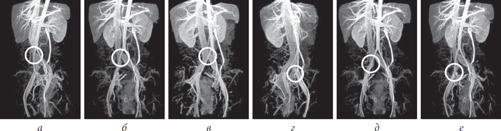 Рис. 1. Магнитно-резонансное исследование нижней полой вены и сосудов малого таза: а — центральный проксимальный артериовенозный конфликт илеокавального сегмента; б — центральный дистальный артериовенозный конфликт илеокавального сегмента; в — левый проксимальный артериовенозный конфликт илеокавального сегмента, или синдром Мея – Тюрнера; г — левый дистальный артериовенозный конфликт илеокавального сегмента; д — правый проксимальный артериовенозный конфликт илеокавального сегмента; е — правый дистальный артериовенозный конфликт илеокавального сегмента (моделирование)