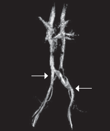 Рис. 2. Магнитно-резонансное исследование нижней полой вены и сосудов малого таза. Левый проксимальный и левый дистальный типы артериовенозных конфликтов илеокавального сегмента. Левой стрелкой указано место компрессии левой общей подвздошной вены правой общей подвздошной артерией. Правой стрелкой указано место компрессии левой наружной подвздошной вены левой наружной подвздошной артерией