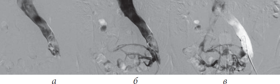 Рис. 3. Антеградная илеокаваграфия у пациента М., 39 лет, с выраженной тазовой симптоматикой (боли, эректильная дисфункция, хронический калькулезный простатит) вследствие синдрома Мея – Тюрнера: а — антеградная катетеризация левой общей подвздошной вены; б — при введении рентгеноконтрастного вещества отмечается его ретроградный заброс и контрастирование венозных сплетений малого таза (коллатеральное кровообращение); в — после контрастирования венозных сплетений малого таза рентгеноконтрастное вещество перераспределяется в правую общую подвздошную вену. Диаметр правой общей подвздошной вены в 1,4 раза меньше диаметра левой общей подвздошной вены