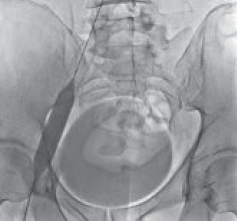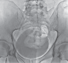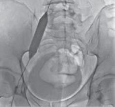 Рис. 4. Антеградная илеокаваграфия пациента М., 39 лет, от 28.03.2017. Отмечается компрессия левой общей и левой наружной подвздошных вен. Оперативный доступ из левой подколенной вены. Положение пациента на животе