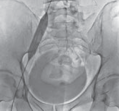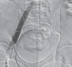 Рис. 6. Имплантация одного стента в левую общую и левую наружную подвздошную вены пациента М., 39 лет, от 28.03.2017. Оперативный доступ из левой подколенной вены. Положение пациента на животе