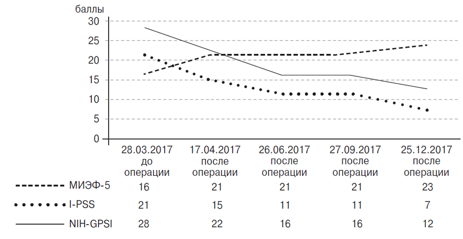 Послеоперационное ведение включало в себя: 1) антикоагулянтную терапию — ривароксабан 20 мг в сутки — в течение 6 месяцев после операции; 2) ультразвуковое ангиосканирование подвздошных сосудов в 1-е сутки, через 2 недели и через 1, 3, 6 месяцев после операции. Результаты оперативного лечения оценивали при помощи опросников МИЭФ-5, I-PSS, NIH-CPSI, а также при помощи ТРУЗИ до операции и через 1, 3, 6 и 9 месяцев после операции (рис. 10). В ближайшем послеоперационном периоде (в течение часа) жалобы на боли в области малого таза практически исчезли, а через неделю после операции пациент отметил восстановление эрекции без какой-либо специфической терапии.