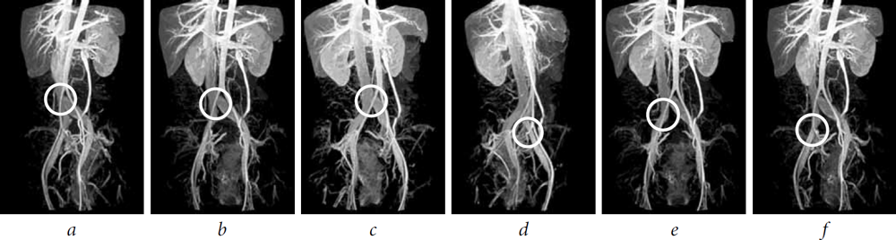 Fig. 1. Magnetic resonance imaging of the inferior vena cava and small pelvic vessels: (a) central proximal arteriovenous obstruction of the ileocaval segment; (b) central distal arteriovenous obstruction of the ileocaval segment; (c) left proximal arteriovenous obstruction of the ileocaval segment or May–Thurner syndrome; (d) left distal arteriovenous obstruction of the ileocaval segment; (e) right proximal arteriovenous obstruction of the ileocaval segment; and (f) right distal arteriovenous obstruction of the ileocaval segment (modeling)