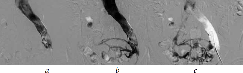 Fig. 3. Antegrade ileocavography of patient M., 39 years old, with pronounced pelvic symptoms (pain, erectile dysfunction, and chronic calculous prostatitis) due to May–Thurner syndrome: (а) antegrade catheterization of the left common iliac vein; (b) note retrograde reflux and contrast of the venous plexus of the small pelvis (collateral circulation) with the introduction of radiopaque substance; (c) after contrasting the venous plexus of the small pelvis, the radiopaque substance is redistributed into the right common iliac vein. The diameter of the right common iliac vein is 1.4 times smaller than the diameter of the left common iliac vein