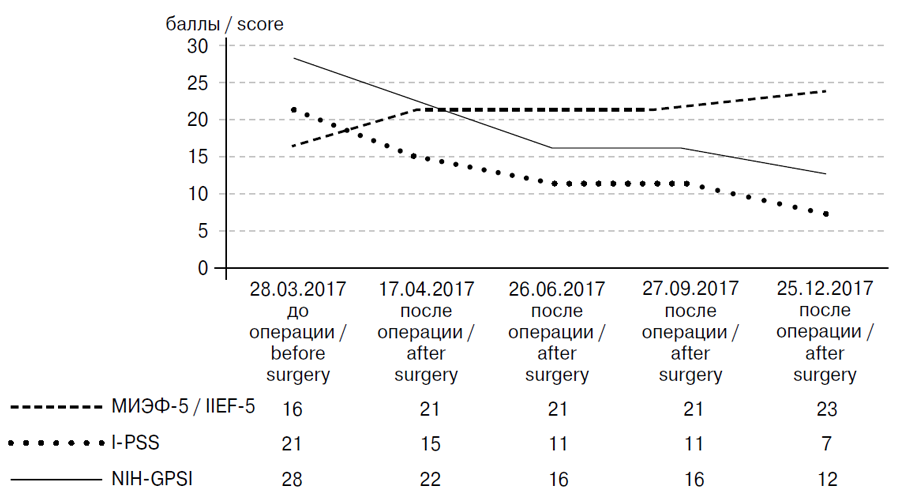 Postoperative management included anticoagulant therapy with rivaroxaban 20 mg per day for 6 months after surgery and ultrasonic angioimaging of the iliac vessels on day one, at 2 weeks and 1, 3, and 6 months after surgery. The results of surgical treatment were assessed with the International Index of Erectile Function (IIEF-5), International Prostate Symptom Score, and National Institutes of Health Chronic Prostatitis Symptom Index questionnaires, and also with the use of TRUS prior to surgery and at 1, 3, 6, and 9 months after surgery (Fig. 10). In the immediate postoperative period (within an hour), complaints about pain in the pelvic region have practically disappeared, and a week after the surgery, the patient noted restoration of erection without any specific therapy.