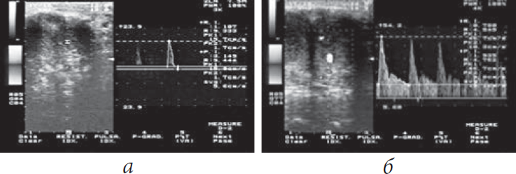 Рис. 1. Ультразвуковая доплерография полового члена больного М., 68 лет, с доброкачественной гиперплазией предстательной железы и артериогенной эректильной дисфункцией, получавшего комбинированную терапию в течение 12 недель (1-я группа): а — Vmax (пиковая систолическая скорость кровотока) в кавернозных артериях снижена до 6,8 см/c; б — после лечения Vmax увеличилась до 24 см/c