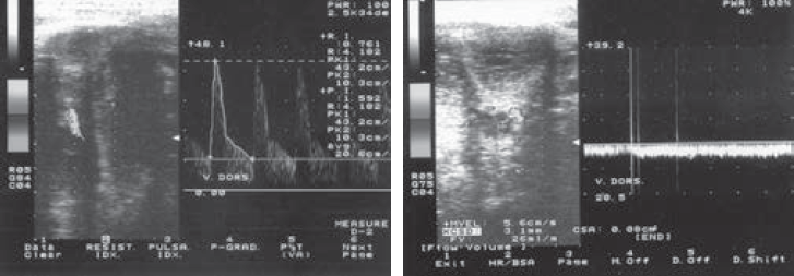 Рис. 2. Ультразвуковая доплерография полового члена больного А., 54 года, с доброкачественной гиперплазией предстательной железы и веногенной эректильной дисфункцией в стадии компенсации (2-я группа). Через 4 недели пиковая систолическая скорость кровотока — 11,2 см/c, проба Вальсальвы (+), в дорсальной вене — 26 мл/мин