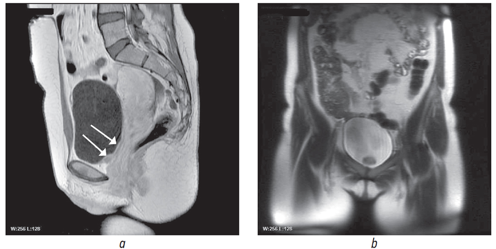 Fig. 1. Contrast-enhanced magnetic resonance image of the pelvis: а – sagittal projection; b – axial projection. The arrows indicate the thickening of the bladder wall