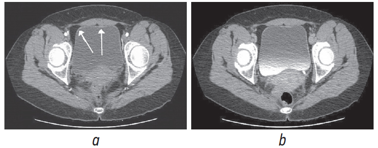 Fig. 2. Multislice computed tomography of the pelvis. Axial projection: а – native, b – with contrast enhancement. The arrow indicates the thickening of the bladder wall