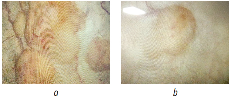 Fig. 3. Cystoscopic picture of malacoplakia of the bladder during surgery: а – left side wall, b – back wall