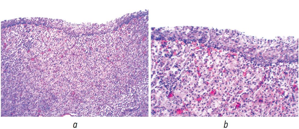 Рис. 4. Гистологическая картина малакоплакии мочевого пузыря. Клетки Ханземанна с тельцами Михаэлиса – Гутмана. Окраска гематоксилином и эозином. Увел. ×200 (а), ×400 (b)