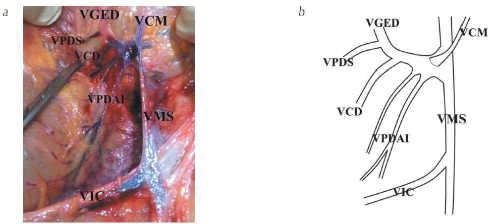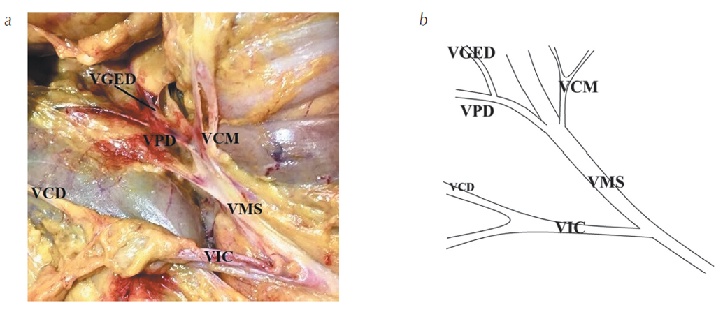 Fig. 1. Variant of venous return from the right half of the colon (observation 1): а — anatomical specimen image; b — sketch. VMS — superior mesenteric vein, VIC — ileocolic vein, VCD — right colic vein, VPD — pancreatoduodenal vein, VCM — middle colic vein, VGED — right gastroepiploic vein
