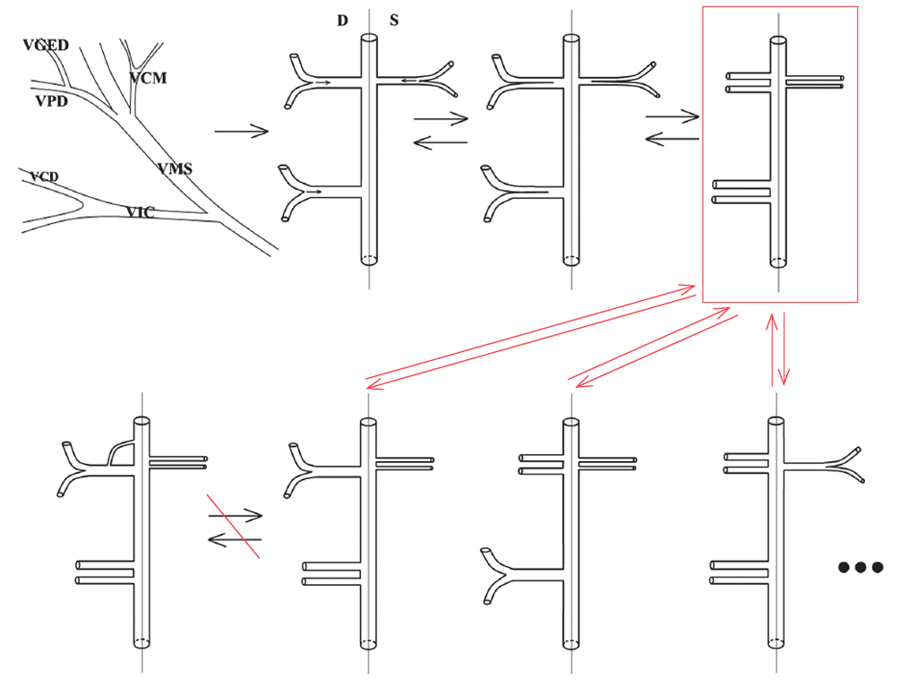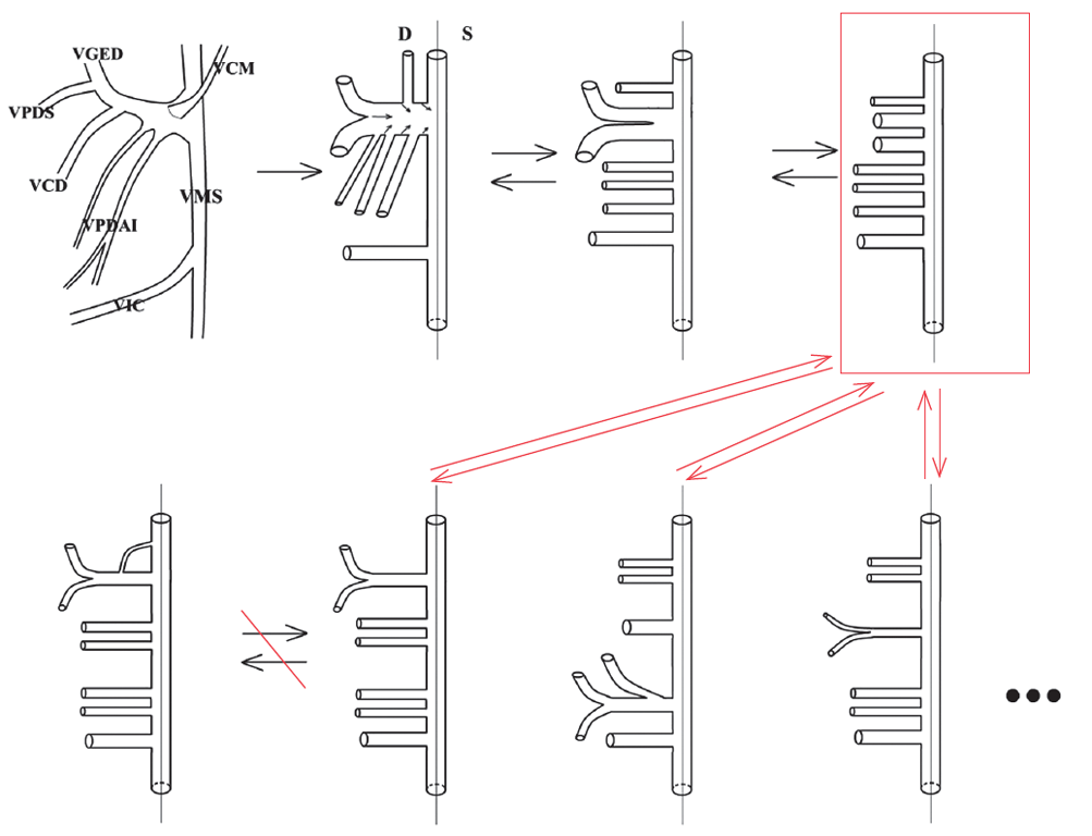 Как видно из рис. 3 и 4, топологические преобразования позволяют привести любой вариант впадения притоков верхней брыжеечной вены к определенному топологическому типу, из которого путем дальнейших преобразований можно получить множество вариантов топологически однотипных анатомических вариантов. Стоит отметить, что если в структуре рассматриваемого анатомического варианта встречаются аркады, соединяющие ветви первого или второго порядка, то полученный топологический тип не будет аналогичен таковому без аркад — между ними невозможны топологические переходы (см. рис. 3, 4).