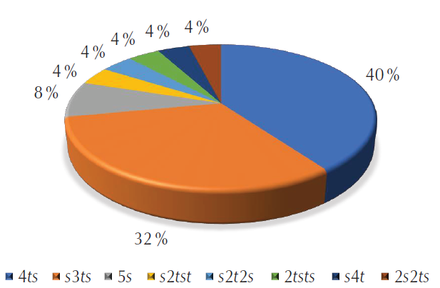 - В результате кодировки и классификации выявленных вариантов на основании принципов топологии и комбинаторики было установлено, что наиболее часто встречающимися топологическими типами являются 4ts и s3ts: соответственно 10-е и 8-е наблюдение из 25.