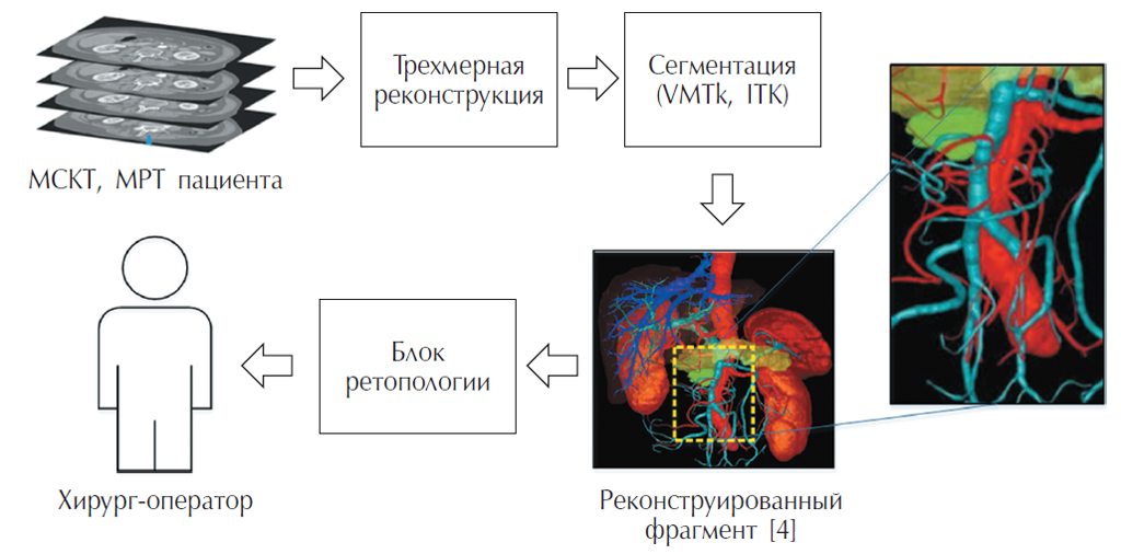 На основе предложенной классификации разрабатывается метод предоперационного планирования правосторонней гемиколонэктомии, основанной на данных, полученных с помощью компьютерной томографии (рис. 6). Трехмерная реконструкция и сегментация анатомических структур осуществляются с использованием open-source-библиотек VMTk (Vascular Mode ling Toolkit) и ITK (Insight Segmentation and Registration Toolkit) для Python [5, 6]. Полученный трехмерный объект перестраивается в блоке ретопологии в соответствии с предложенной классификацией. Результатом преобразований является упрощенная, но топологически эквивалентная интерпретация притоков верхней брыжеечной вены, которая позволяет хирургу спланировать клипирование, пересечение или резекцию венозного сегмента зоны интереса.