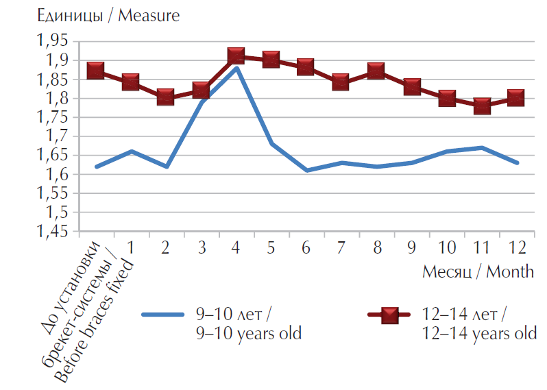 До начала лечения уровень гингивита соответствовал пограничным значениям — легкой и средней степени тяжести, что, возможно, объясняется недостаточной индивидуальной гигиеной полости рта из-за дистопии зубов. Однако через 1 месяц после фиксации брекет-системы индекс гингивита увеличился. Через 4 месяца после начала лечения у пациентов 12–14 лет состояние пародонта по оценочному индексу соответствовало тяжелой степени тяжести, а у пациентов 9–10 лет на 5–6-й месяц наблюдения практически достигло исходного уровня — легкой степени тяжести. На протяжении дальнейшего исследования в группе детей 12–14 лет индекс гингивита также соответствовал средней и тяжелой степеням тяжести, и его значения были в пределах 1,95–2,3. У детей 9–10 лет на 12-й месяц исследования индекс гингивита остался таким же, как вначале, однако наблюдались небольшие колебания значений.
