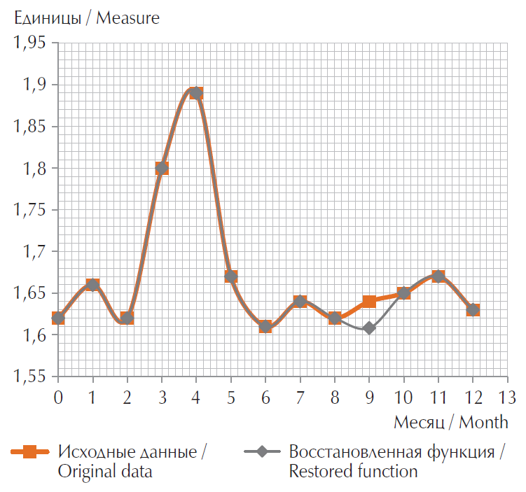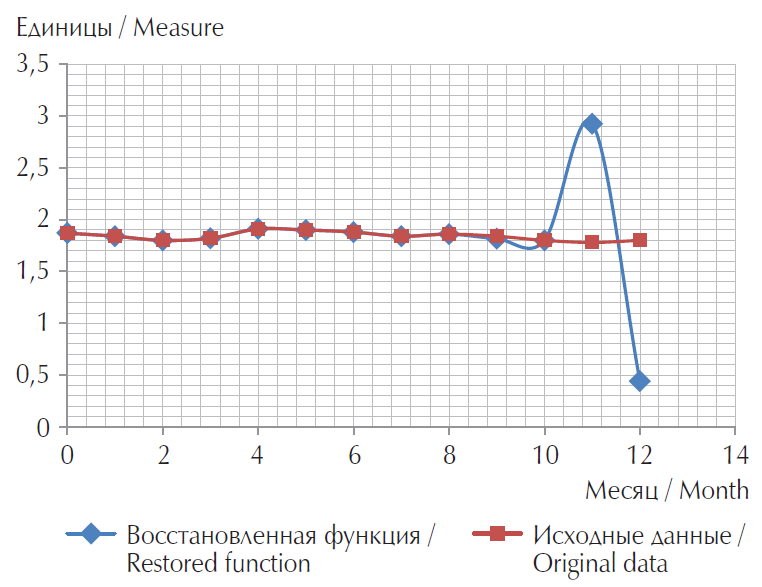 На этапе восстановления функции получено расхождение в точке х = 9 на рис. 2 и в точках х = 11 и х = 12 на рис. 3. С позиции математического моделирования это означает проявление каких-то дополнительных факторов, которые повлияли на полученные данные, однако не были учтены врачом-ортодонтом при проведении исследования.