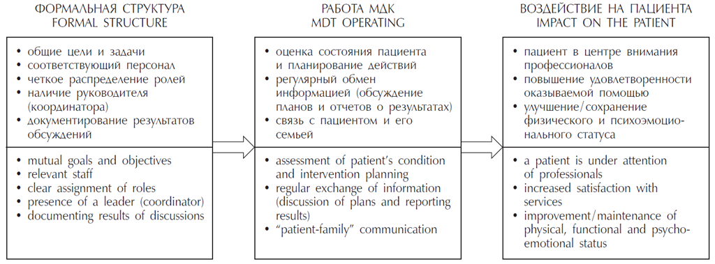 В российской медицинской практике нет четкого разделения терминов [4, 5], хотя чаще используют термин «мультидисциплинарная», обычно при этом подразумевается «командный подход» вообще [6]. Это можно объяснить тем очевидным обстоятельством, что перечисленные модели являются эволюционным продолжением друг друга, поэтому степень интеграции членов команды в конечном счете определяется их умениями и опытом командной работы, а также стоящими перед командой задачами.