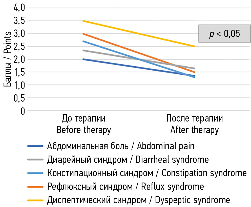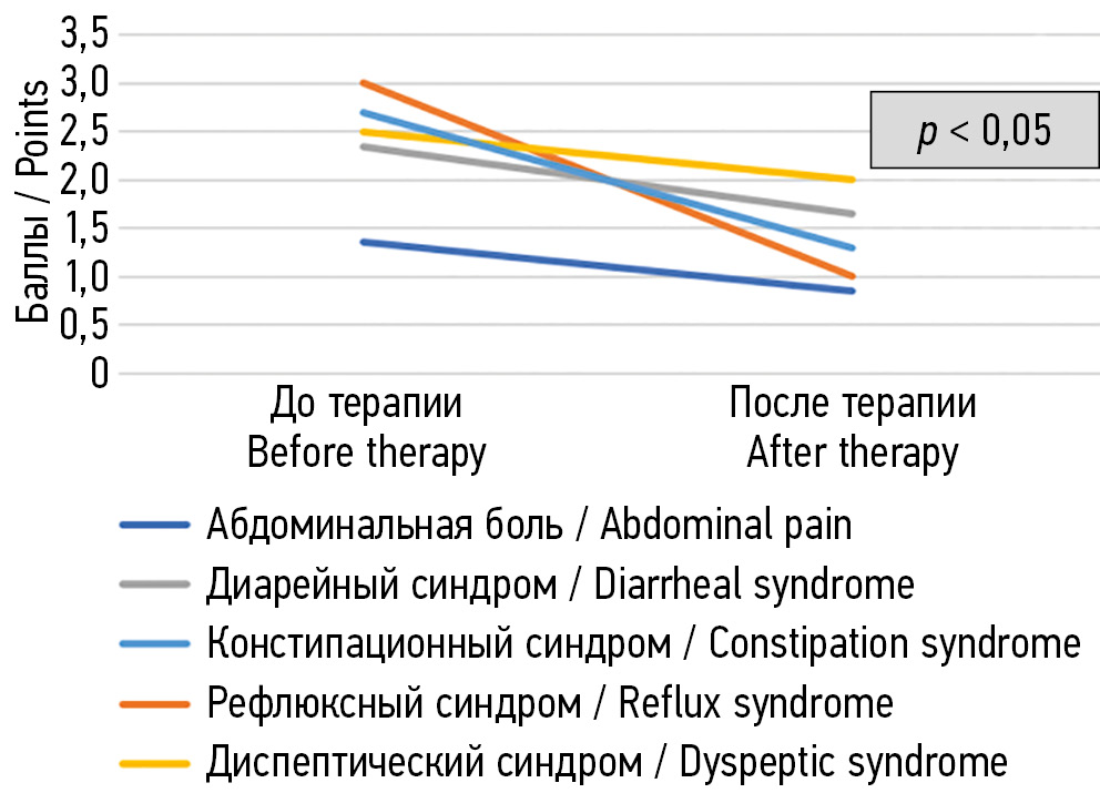 Рис. 2. Динамика гастроэнтерологических жалоб по результатам тестирования опросником Gastrointestinal Symptom Rating Scale в группе промышленного Enterococcus faecium L3 / Fig. 2. Dynamics of gastroenterological complaints according to the results of testing with the GSRS questionnaire in the group of industrial E. faecium L3