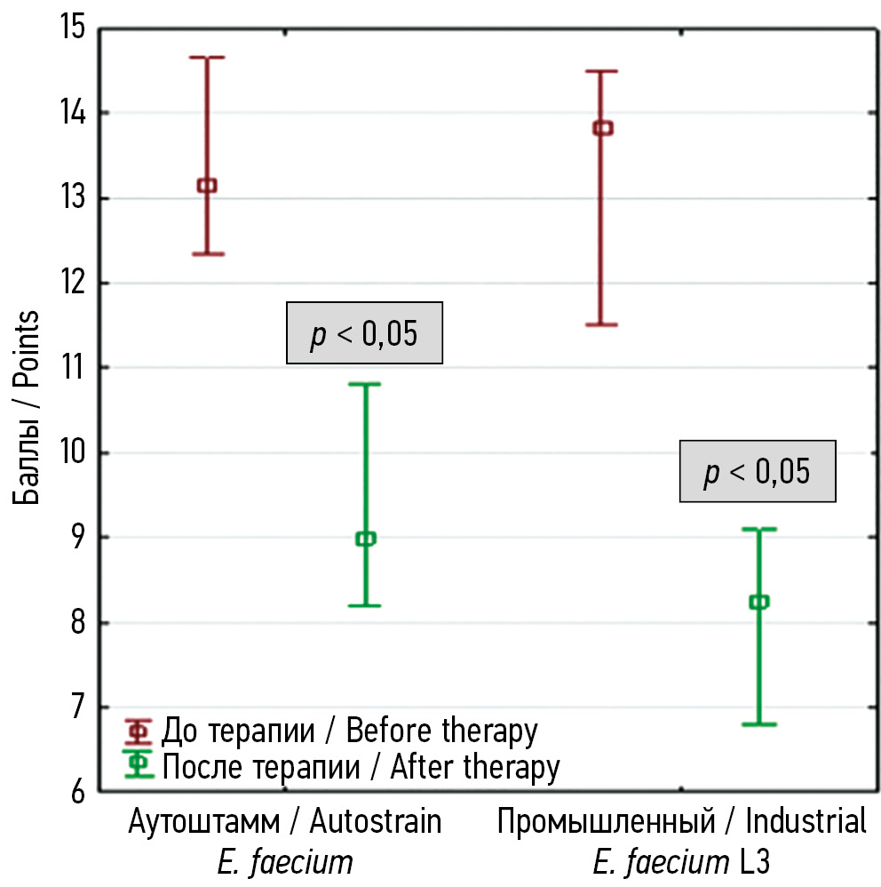 Рис. 3. Динамика баллов по шкале суммарного измерения опросника Gastrointestinal Symptom Rating Scale в группах терапии аутоштаммом Enterococcus faecium и промышленным штаммом Enterococcus faecium L3 / Fig. 3. Score dynamics according to the scale of the total measurement of the GSRS questionnaire in the groups of therapy with the E. faecium autostrain and the industrial E. faecium L3 strain