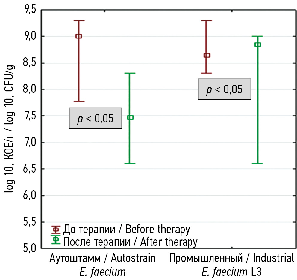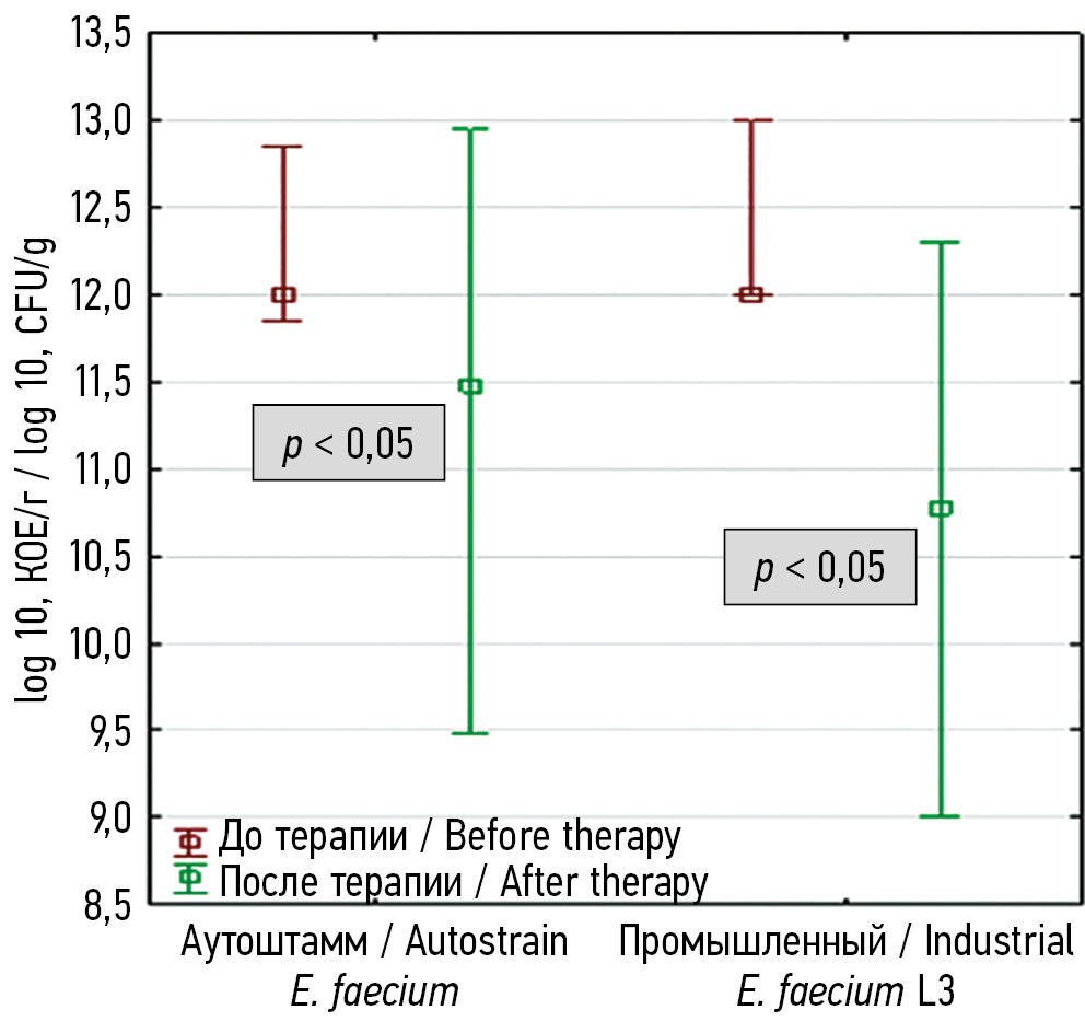 В группах терапии аутоштаммом E. faecium и промышленным штаммом E.faecium L3 зафиксировано достоверное уменьшение количества бактероидов — с 12,70 [11, 85; 13, 00] до 11,00 [9, 70; 13, 00] и с 12,78 [12, 00; 13, 00] до 10,78 [9, 00; 12, 30] log 10 КОЕ/г соответственно (p = 0,043 при использовании критерия Вилкоксона для парных показателей). Отмечено также достоверное уменьшение Bacteroides thetaomicron с 8,48 [7, 30; 9, 30] до 6,85 [6, 48; 7, 85] и с 8,24 [5, 60; 9, 48] до 6,48 [0, 00; 7, 70] log 10 КОЕ/г соответственно (p = 0,028 при использовании критерия Вилкоксона для парных показателей).
