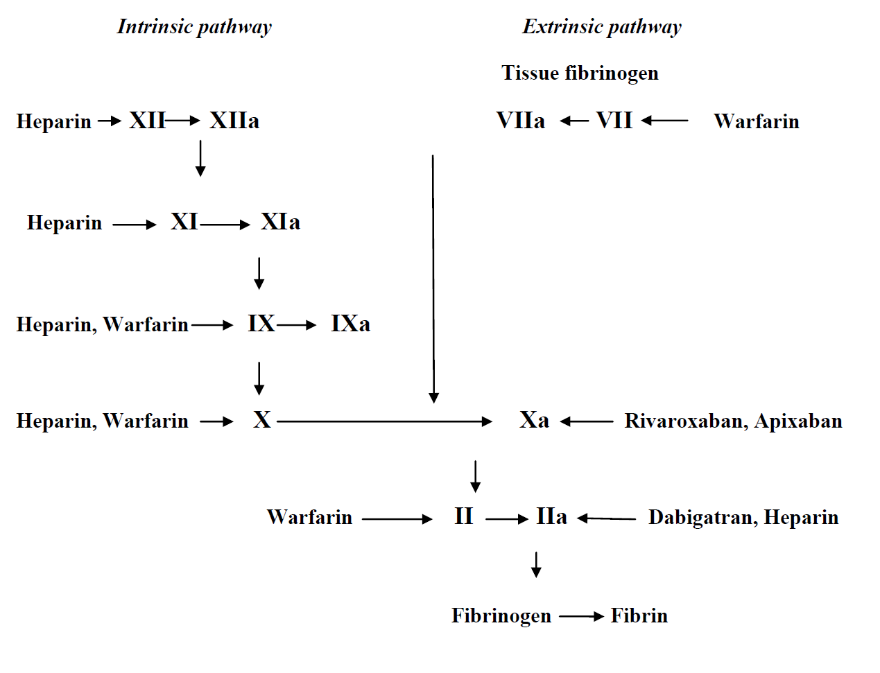 Коагуляционный каскад может активироваться как внутренним, так и внешним путем, что в конечном счете приводит к активации тромбина и последующему образованию фибрина. Гепарин ингибирует активность факторов IX, X, XI, XII, тромбина (IIа). Антагонисты витамина K (варфарин) индуцируют гипокоагуляцию посредством ингибирования активации коагуляционных факторов II, VII, IX и X. Прямые пероральные антикоагулянты оказывают антикоагулянтный эффект путем блокирования активности факторов свертывания Ха (ривароксабан и апиксабан) и IIa (дабигатран) [6].