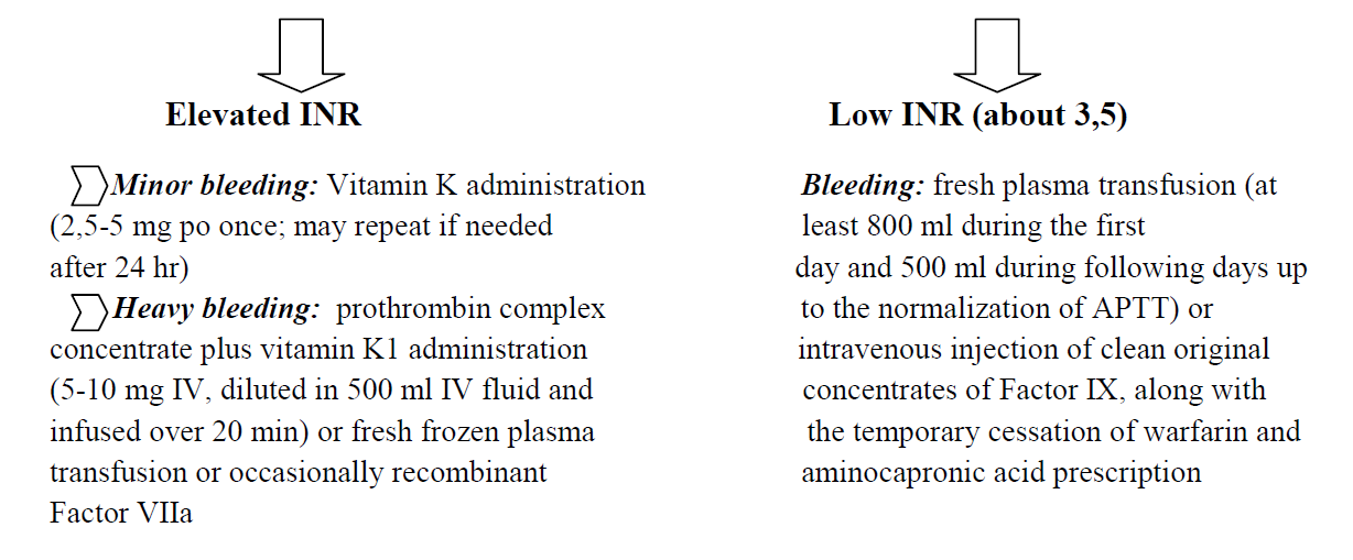 Поскольку период полураспада варфарина составляет 17 ч, назначение препаратов витамина K (концентрат протромбинового комплекса) и/или переливание свежезамороженной плазмы позволяет корригировать МНО. При назначении витамина K предпочтительно использовать препараты витамина K1, а не витамина K3. Если у пациента нет активного кровотечения и нет необходимости в срочной коррекции МНО, предпочтительно пероральное назначение витамина K1 в дозе 1–2 мг или при высоком МНО — в дозе 5 мг. Для лечения массивного, угрожающего жизни кровотечения необходимо вводить витамин K1 медленно в дозе 10–20 мг не менее 30 минут; после внутривенного введения эффект достигается через 2–4 ч, максимальный эффект наблюдается через 24 ч независимо от способа введения [18, 19]. Показатели коагулограммы должны после терапии полностью нормализоваться. Иногда это занимает недели или месяцы.