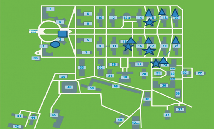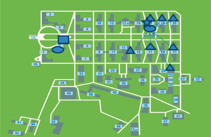 Рис. 1. Расположение центральной клинико-диагностической лаборатории (прямоугольник), двух экспресс-лабораторий (овал) и семи отделений реанимации и интенсивной терапии (треугольники) в СЗГМУ им. И.И. Мечникова и движение биопроб для исследования газов и электролитов (стрелка), анализатор газов и электролитов (звезда)