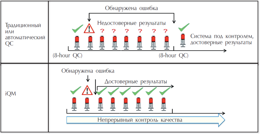 Активный контроль качества (iQM — intelligent Quality Management) в этом анализаторе проводится после каждого анализа, а не через 8 часов, как у традиционного анализатора (рис. 2). При этом не уменьшается количество тестов в картридже, происходит распознавание вида ошибки, автоматическое ее исправление без участия оператора, и все это фиксируется в отчете о совершенных корректирующих действиях [15].
