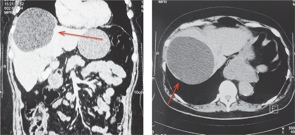 Главная особенность непаразитарных кист печени заключается в их преимущественно бессимптомном течении. Неопределенные боли в правом подреберье и эпигастральной области связаны со сдавлением паренхимы печени и растяжением глиссоновой капсулы (проявляются ноющими и тупыми болями в правом боку и около пупка, чувством тяжести и давления в области правого подреберья и подложечной области, нарушением стула, тошнотой, рвотой (после приема пищи)). Также может наблюдаться асимметрия живота, определяться опухолевидное образование в правом подреберье. При компрессии воротной вены развиваются признаки портальной гипертензии (асцит, варикозное расширение вен в пищеводе и др.); при компрессии желчных протоков — механическая желтуха; при сдавлении 12-перстной кишки — дуоденостаз [4, 9].