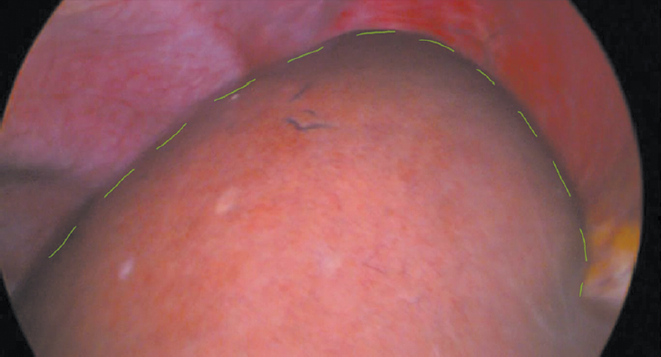 Под комбинированной анестезией параумбиликально, доступом по Хассену установлен лапаропорт. Карбоксиперитонеум — 12 мм рт. ст., установлены оптическая система, троакары с рабочими инструментами: 2 троакара по 5 мм — в правое подреберье, троакар 12 мм — в эпигастрии. При ревизии: прядь сальника и 12-перстной кишки подпаяна к краю правой доли печени (спайки разобщены). В брюшной полости выпота нет. Желчный пузырь размером 10 × 4 × 4 см. Раздельно выделены, клипированы и пересечены пузырный проток и пузырная артерия. Выполнена холецистэктомия «от шейки». Ложе желчного пузыря обработано электрокоагуляцией. В проекции VII сегмента с переходом на VIII сегмент печени визуализирована киста (рис. 2).