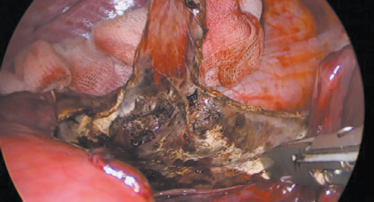 Выполнена пункция, получено около 700 мл, прозрачного экссудата (материал отправлен на бактериологическое исследование). Стенки кисты иссечены с помощью аппарата LigaSure (препарат отправлен на патогистологическое исследование). Ложе кисты обработано аргоноплазменной коагуляцией (Söring) (рис. 3). Выполнен контроль гемостаза и холестаза. Установлены дренаж в ложе желчного пузыря и два дренажа в ложе кисты.