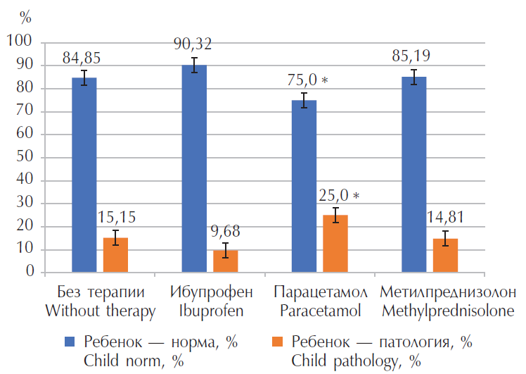 Fig. 3. The assessment of the influence of antenatal use of nonsteroidal anti-inflammatory drugs and glucocorticoids on the child within 12 months of observation (* р < 0.05)