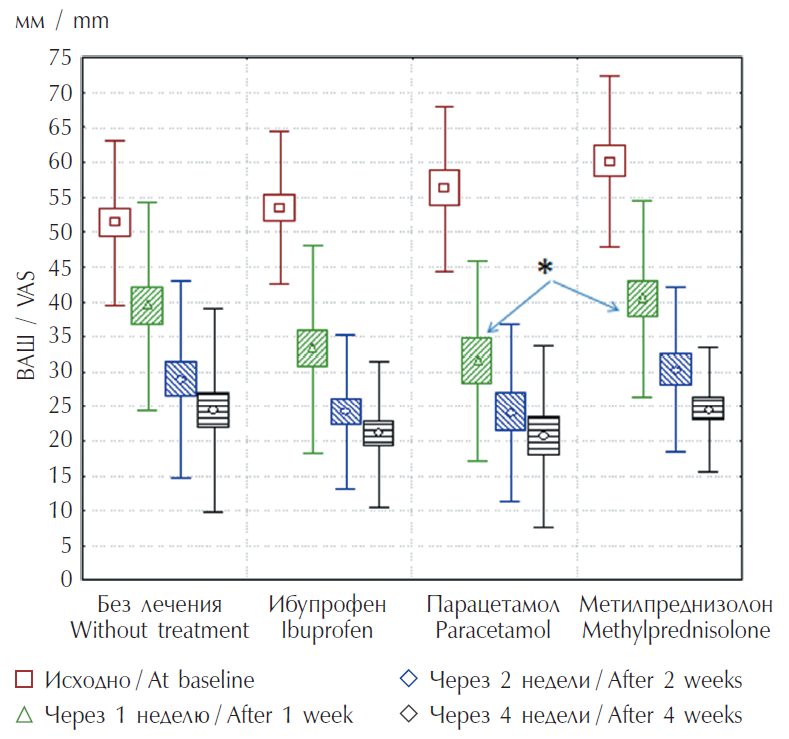 На фоне лечения наблюдалось уменьшение интенсивности болевого синдрома в ТБС у пациенток всех групп лечения (рис. 2). При этом не было отмечено принципиальных отличий в достижении анальгетического эффекта при приеме ибупрофена и парацетамола за весь период применения препаратов (до четырех недель). У пациенток с вторичным остеоартритом, получавших метилпреднизолон, выявлено статистически значимое (р < 0,05) улучшение по данным ВАШ по сравнению с другими клиническими группами.