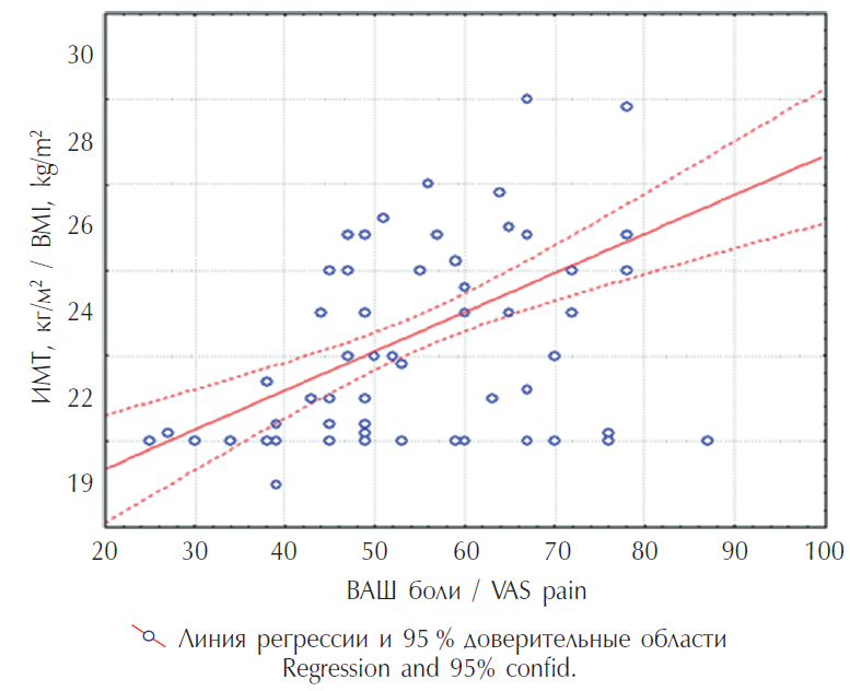 Рис. 1. Зависимость между интенсивностью болевого синдрома (по данным визуальной аналоговой шкалы) и индексом массы тела